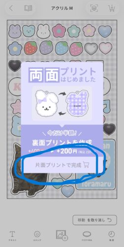 すると、両面印刷をするかどうかが出てくるので、「片面プリントで完成」をタップします。